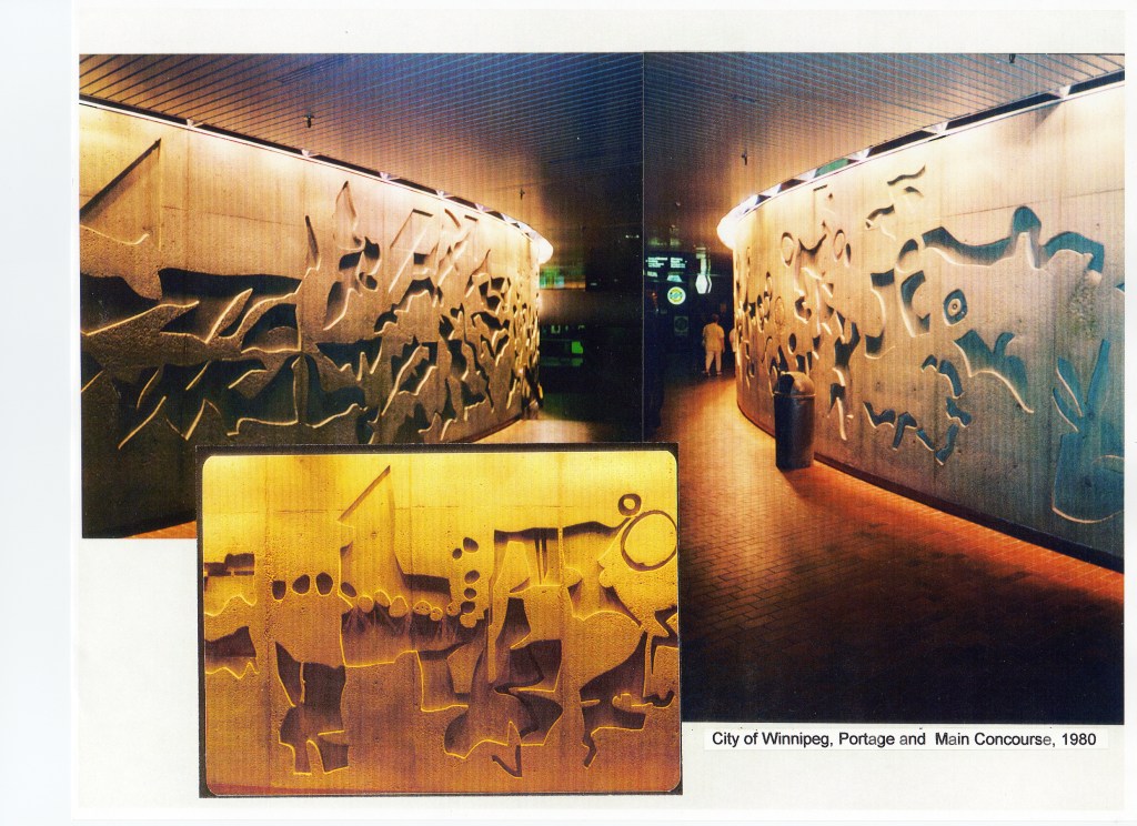 Aside from the concourse wall, perhaps his most easily-spotted public works can be seen in the lobby of the Woodsworth Building and the Manitoba Hydro lobby in downtown Winnipeg.